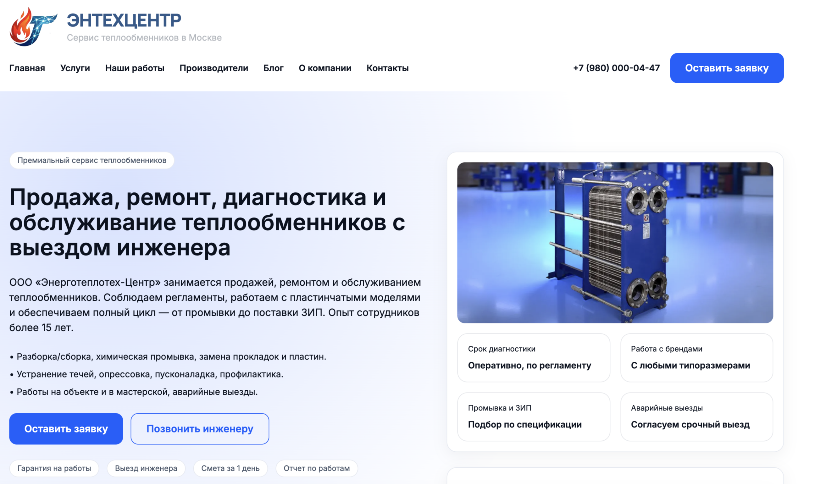 Уникальный контент: Написано содержание всех страниц, ориентированное на целевую аудиторию (предприятия и частные лица, нуждающиеся в обслуживании теплообменников).